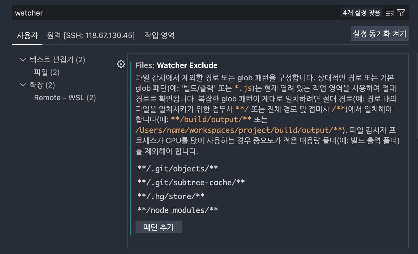 'watcher'을 검색한 후, '**/node_modules/*/**'을 '**/node_modules/**'로 바꿔주면 됩니다.
