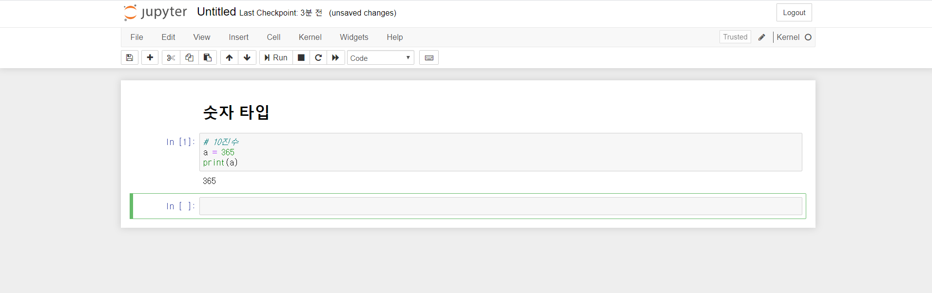코드를 입력하고 Shift + Enter 을 누르거나 또는 Run을 클릭하면 실행이 되어 결과가 출력됩니다.