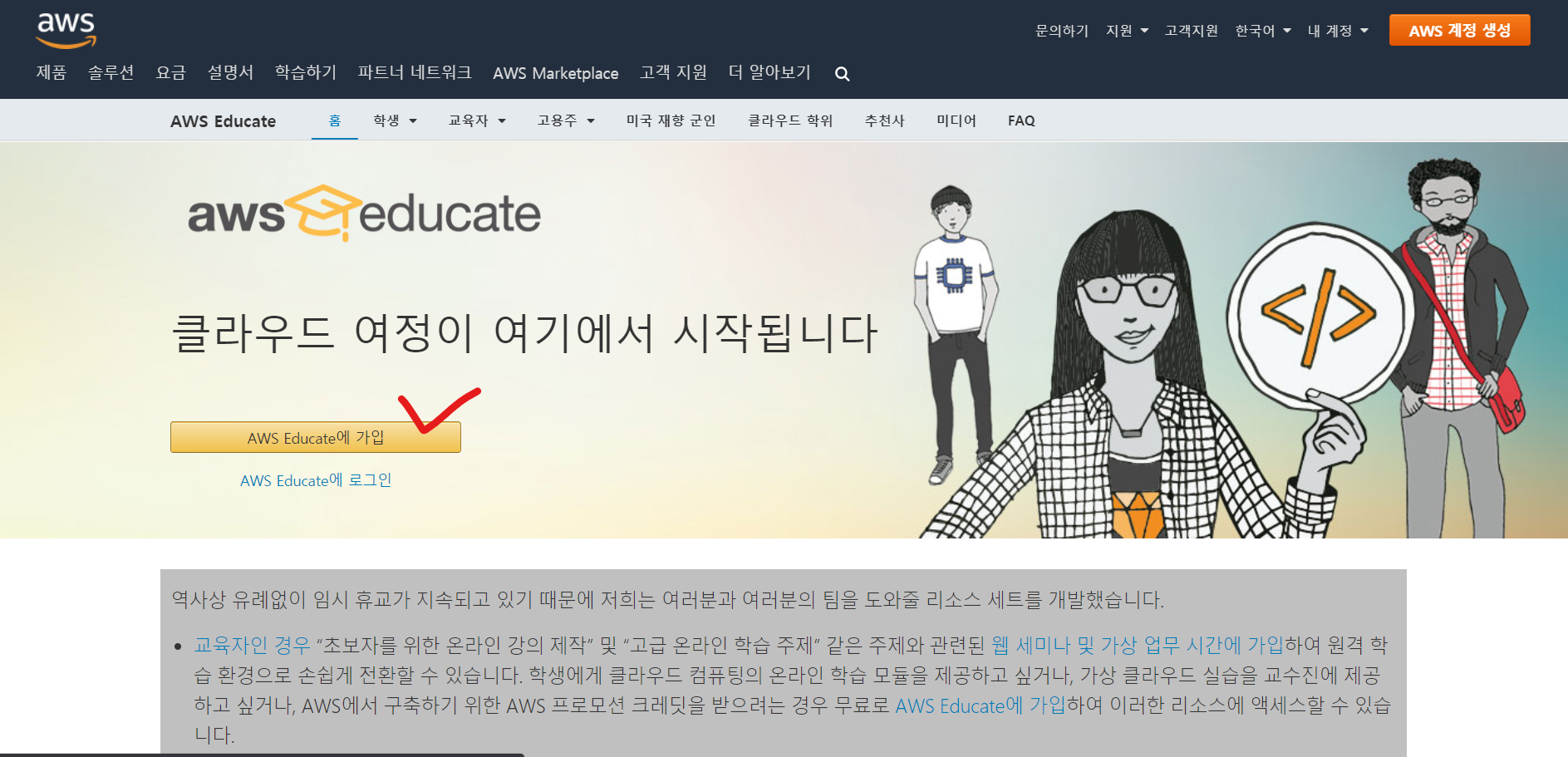 AWS Educate에 가입하기 위해서는 하단의 링크로 들어가야 합니다.