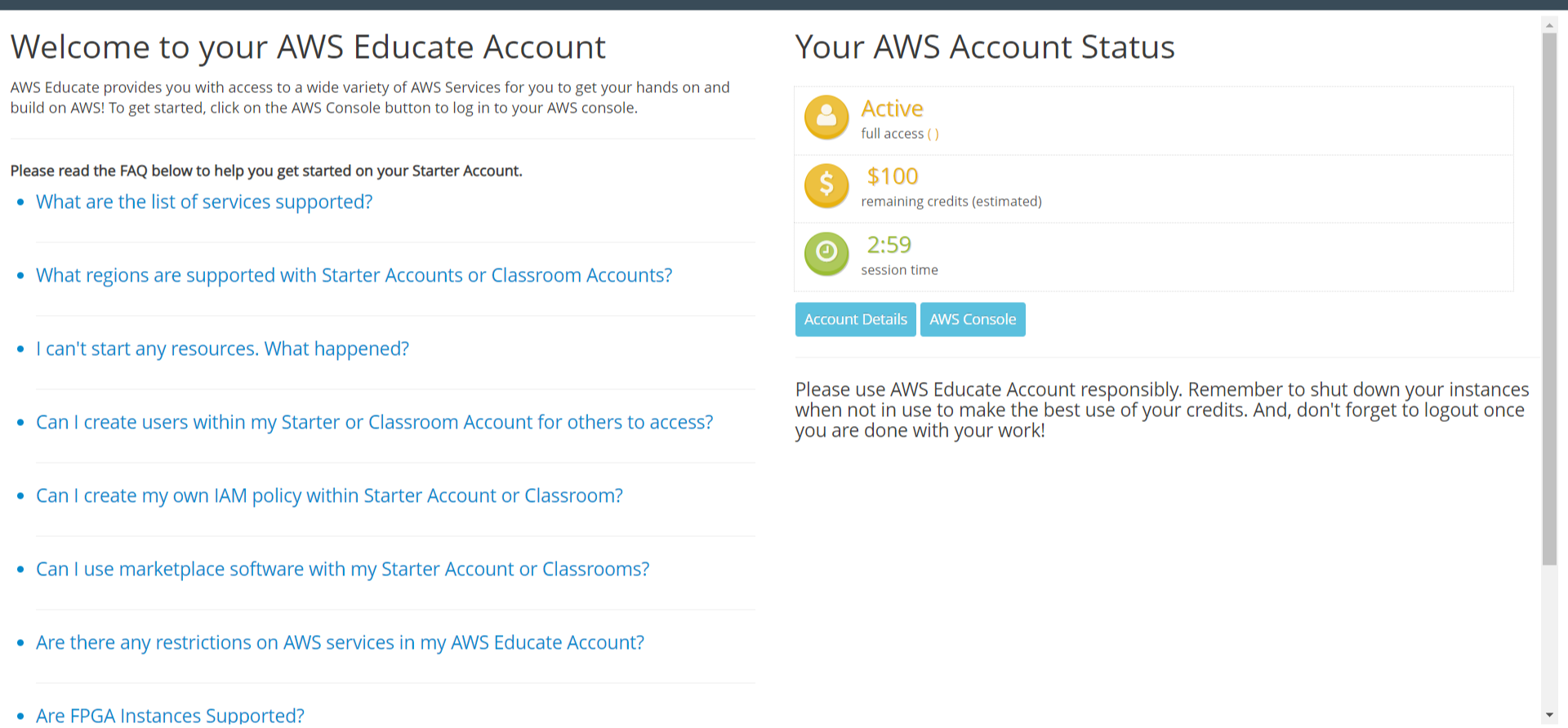 (2020년부터는 AWS 계정 없이도 AWS Educate계정을 만들 수 있다고 하는데, AWS Console과 연결하려면 AWS 계정이 필요하겠죠)