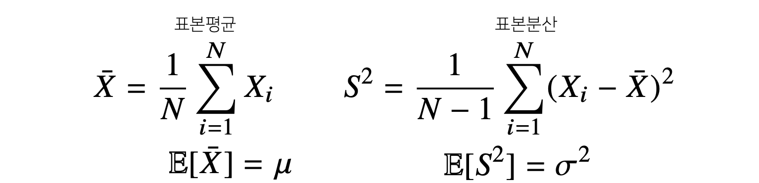 (N대신 N-1개로 나눔 : 불편(unbiased)추정량을 구하기 위함, 기대값을 취했을 때 원래 모집단에 일치하는 것을 목표로 하기 위함) - 표본분산의 기댓값 $\mathbb{E}[S^2]$ : 원래 데이터(모집단)의 분산과 같음