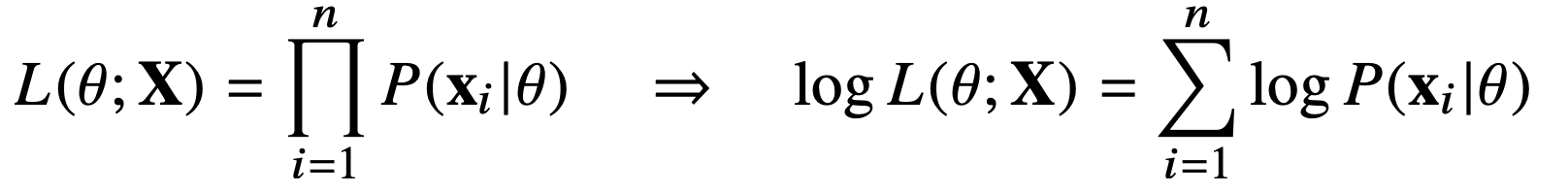 - 데이터 집합 $X$가 독립적으로 추출되었을 경우 로그가능도를 최적화