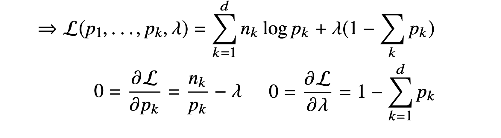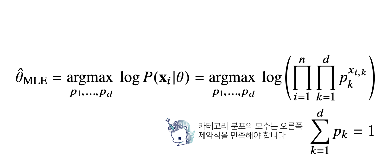 카테고리 분포 Multinoulli($x;p_1,...,p_d$)를 따르는 확률변수 $X$로부터 독립적인 표본 {$x_1, ... ,x_n$}을 얻었을 때 최대가능도 추정법을 이용하여 모수를 추정하면?