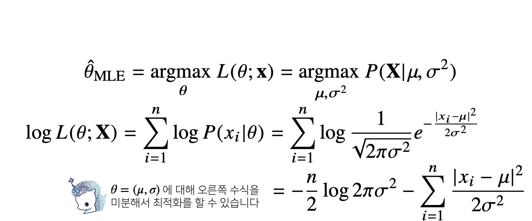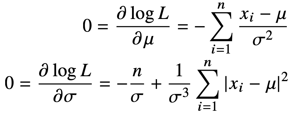 - $\mu$와 $\sigma$로 미분한 후 각 식이 0이 되는 $\mu$, $\sigma$를 찾으면 가능도를 최대화