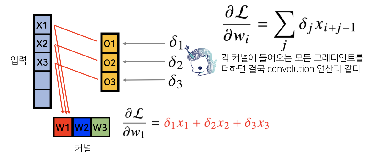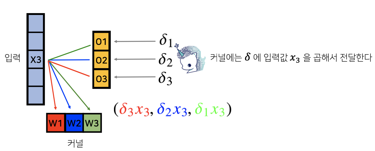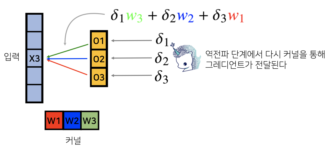 - 입력벡터는 곱해졌던 커널들을 통해 그래디언트 전달