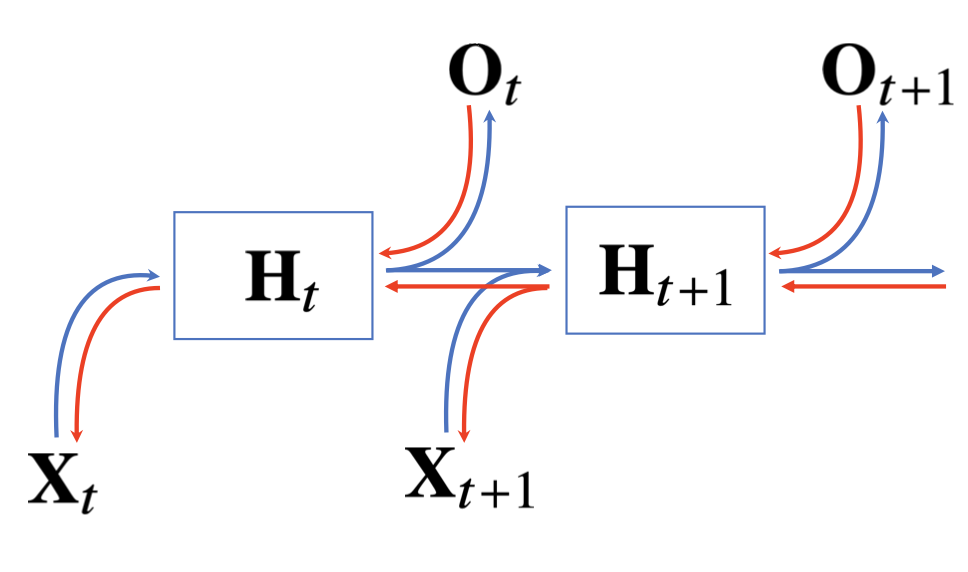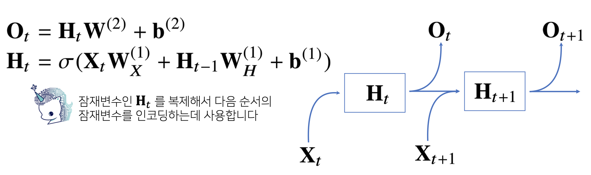 - $H_t$ : 과거 바로 이전의 데이터 $X_{t-1}$와 이전 잠재변수 $H_{t-1}$