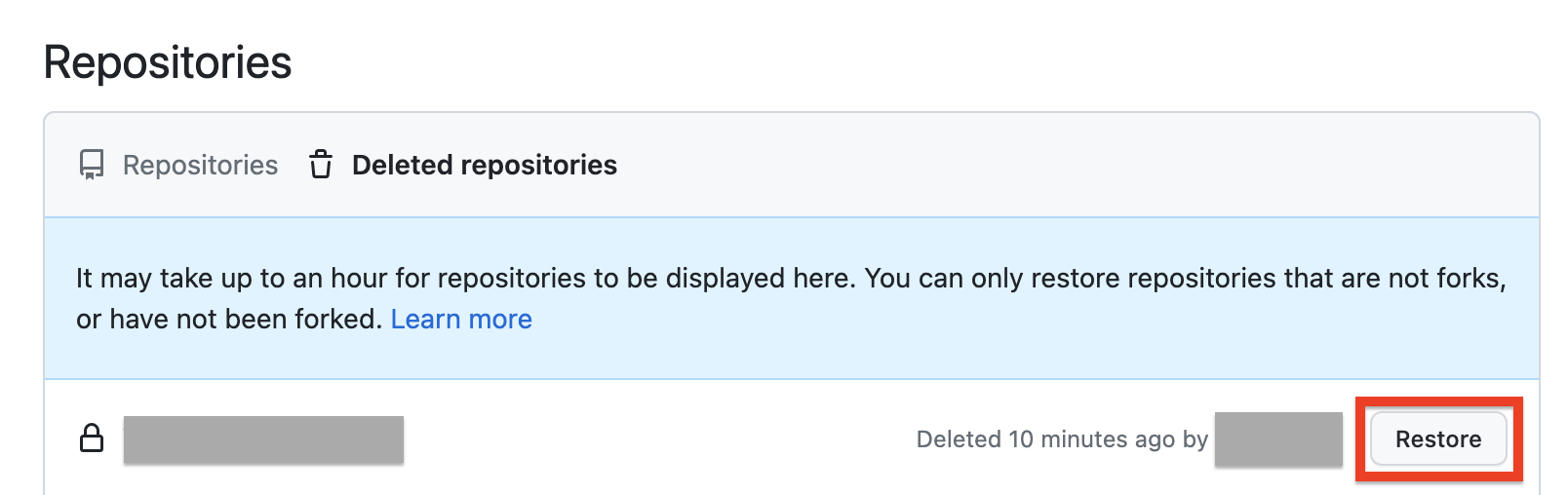 공식 문서를 참고하면, 90일 내에 삭제된 리포지토리를 복원할 수 있습니다. 하지만 해당 리포지토리가 포크된 리포지토리거나, 포크한 리포지토리인 경우 복구 불가능하다고 합니다.